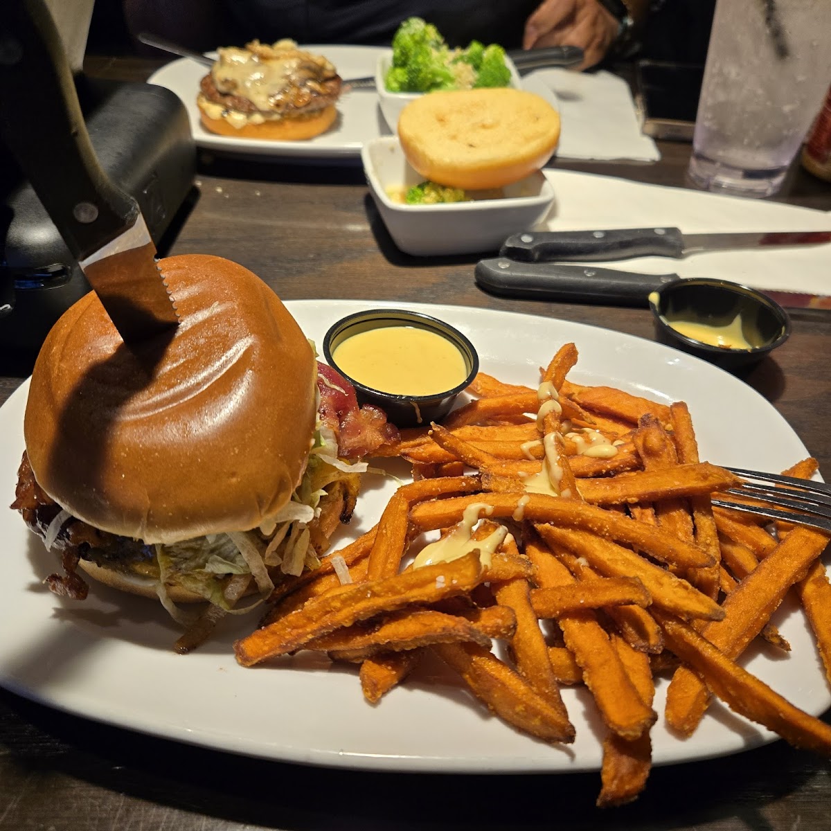 Cannot stress enough how great David was as our server. If we had questions he had answers, if he wasn’t sure, he found out. The food came out quickly, hot, fresh and delicious. We had the Bourbon BBQ burger with fries. Yum! They were amazing and cut it in half in the kitchen for us to share. We ordered the pretzel bites with the crazy good beer cheese. Thumbs up all of the way!! Our first time at this location and we will be back and request David to be our server if he is available. Thank you for the great experience!!